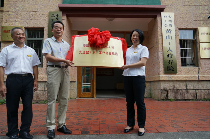 在黄山工人疗养院的大力支持下,安徽省教科文卫体工会7月14日在黄山工人疗养院举行了先进教(职)工疗休养基地挂牌仪式。安徽省教科文卫体工会先进教(职)工疗休养基地挂牌旨在引导全省各级教育工会、高校及附院工会、科文卫体系统工会为广大一线的先进教(职)工疗休养切实做好优质服务工作。参加安徽省教科文卫体工会2017年农村中小学优秀教职工疗休养的优秀教职工见证了挂牌。